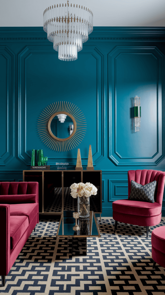 Pick a garnet velvet tuxedo sofa, a fan-back accent chair, and a mirrored coffee table that visually disappears. Add a deco-pattern rug in cream and black for structure.
