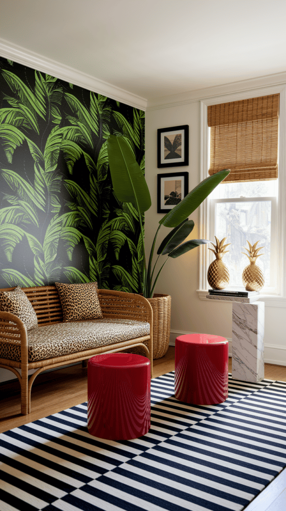 Choose a slim-profile rattan settee with leopard cushions for an unexpected twist. Add a marble-topped pedestal table, a banana-leaf plant in a woven basket, and a pair of lacquered red stools for punchy extra seating.