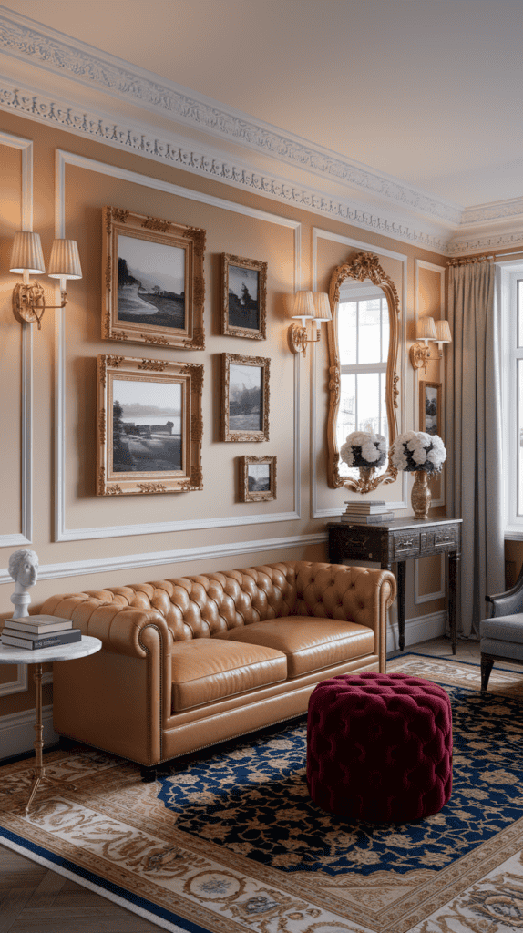 Bring in a camel leather settee, a tufted ottoman in burgundy velvet, and a marble bistro table as your side table. Layer a traditional rug with deep blues and golds underfoot.
