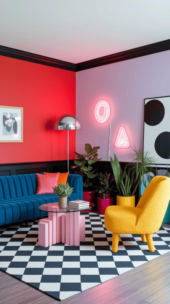 Finish with a checkerboard wool rug, a few neon signs, and oversized abstract art in black-and-white. Add chrome mushroom lamps and a cluster of plants in color-dipped pots. It’s lively, modern, and ultra Instagrammable.