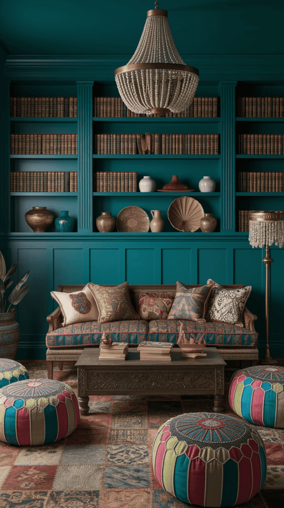 Install floating bookshelves over a vintage kilim sofa layered with embroidered cushions. Add a carved wood coffee table and a stack of patterned poufs as moveable seating.