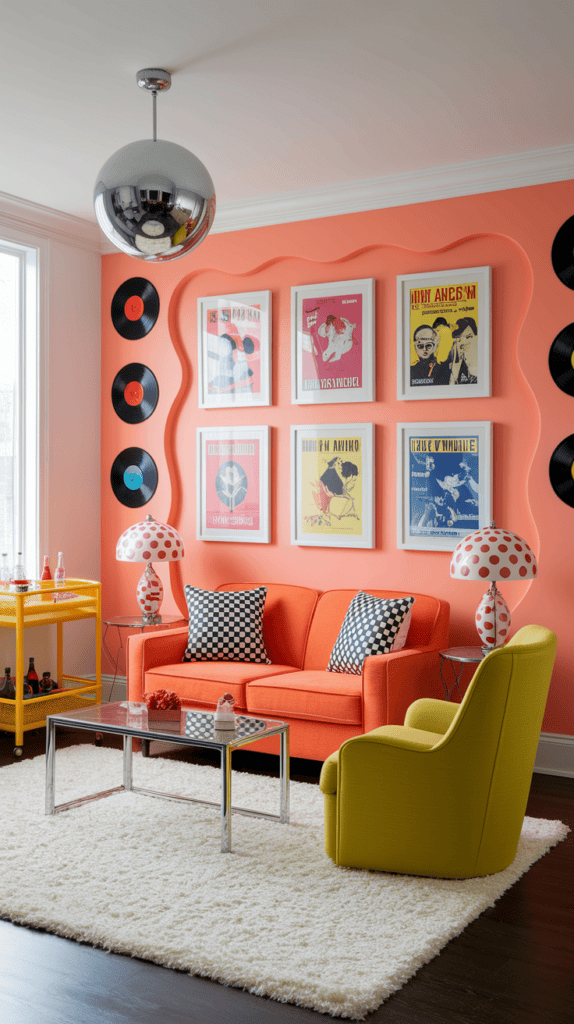 Hang retro band posters in white frames and dot the room with mushroom lamps and a Sputnik pendant. Use a bar cart in lemon yellow as a side table. Finish with colored vinyl records displayed like art for a playful, polished vibe.