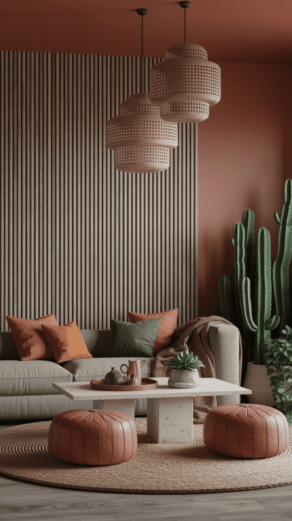 Choose a stone-hued linen sofa, a low-profile travertine coffee table, and woven leather stools. Layer textiles: a jute rug under a smaller patterned kilim, plus mudcloth pillows in terracotta, olive, and ochre.
