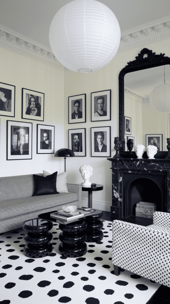On the walls, go heavy with black-and-white photography in mismatched frames. Throw in a giant floor mirror with a black frame to expand the space, and finish with paper lanterns, ceramic busts, and a black marble pedestal. It’s high drama, zero color, maximum impact.