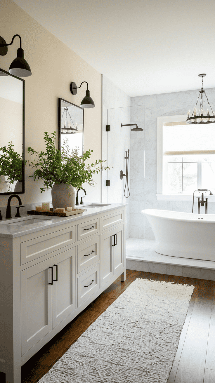 For a modern farmhouse look, consider incorporating black accents for contrast—black fixture hardware, mirror frames, or even a bold black vanity against white walls creates dramatic impact.