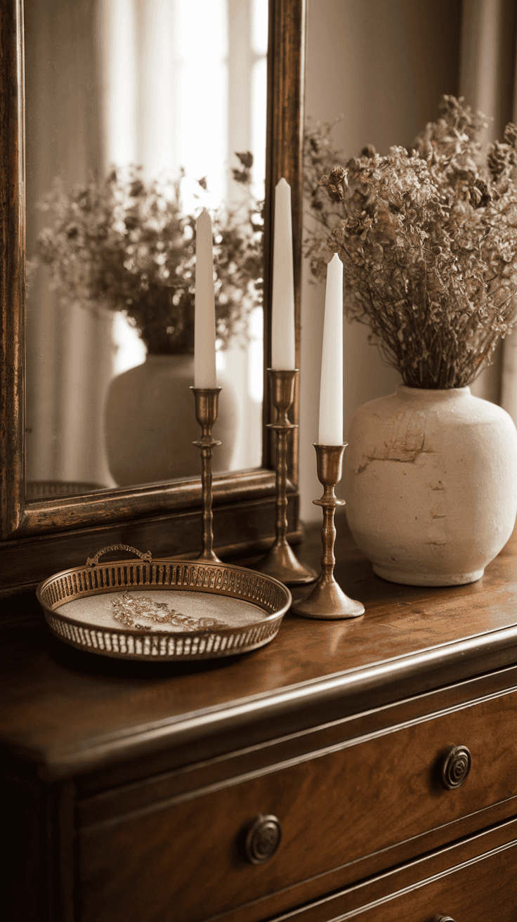 A touch of warm metal adds sophistication to boho spaces. Look for brass candle holders, small trays, or picture frames at thrift stores. You can even update existing furniture by swapping out handles and knobs for brass ones—an easy and affordable upgrade that makes cheap furniture look more expensive.