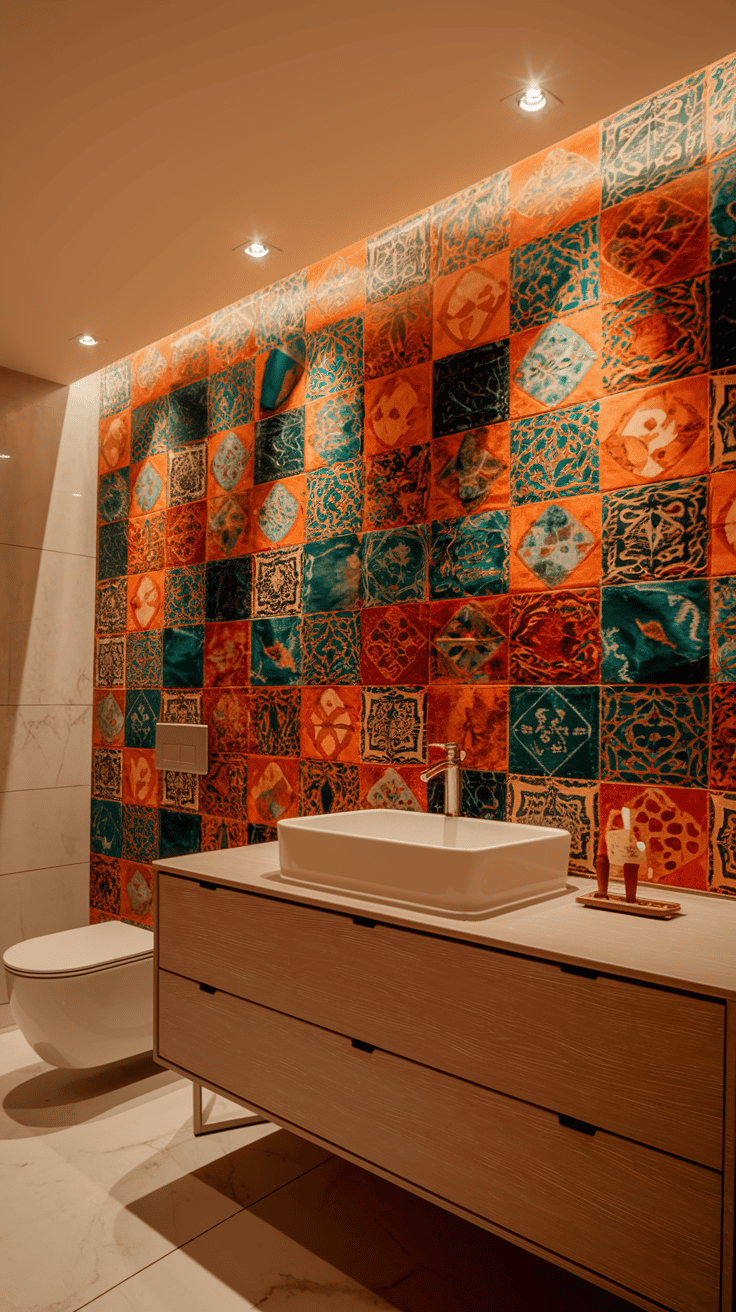 The mix of blue, orange, and white tiles creates a cheerful contrast. Each tile showcases its own distinct design, adding layers of interest to the wall. This playful use of color and pattern can transform an ordinary bathroom into something extraordinary.