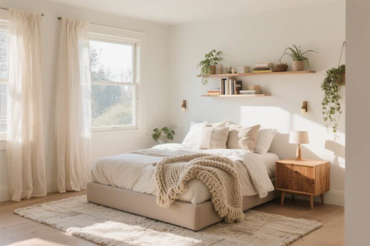 This one is a whisper-quiet retreat—calm, clean, and irresistibly cozy. Picture a low-profile platform bed tucked into the corner, flanked by a slim pine-ledged headboard that wraps the wall like a hug.