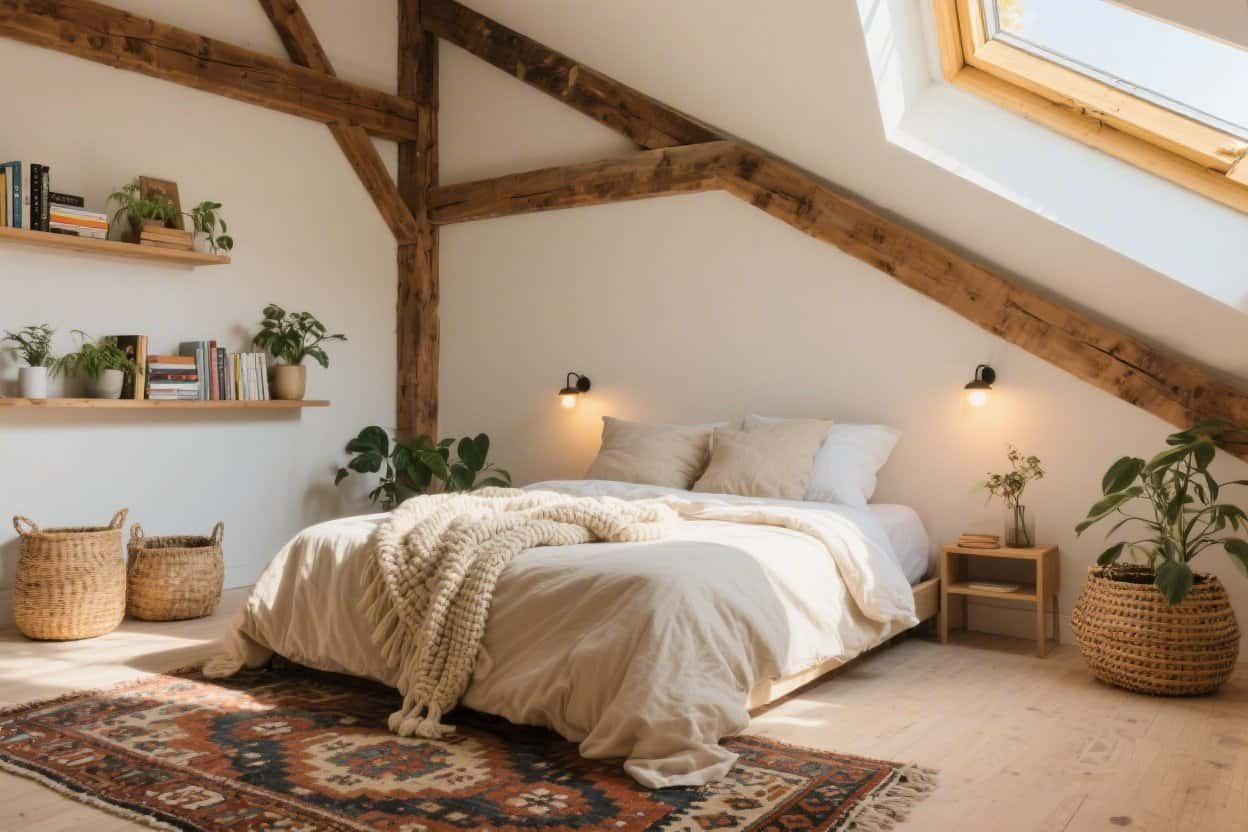 - Go low and soft: Low furniture and plush textiles reduce visual bulk under sloped ceilings.
