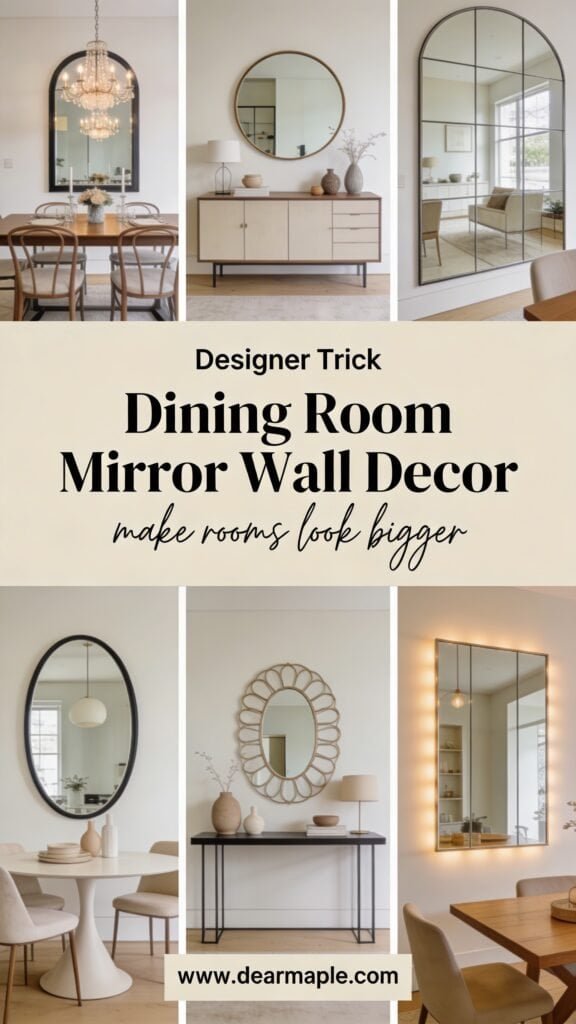 A mirror accent wall creates a dramatic focal point in the dining room while also making the space feel significantly larger. Because mirrors reflect both light and surrounding decor, the room instantly feels more open.