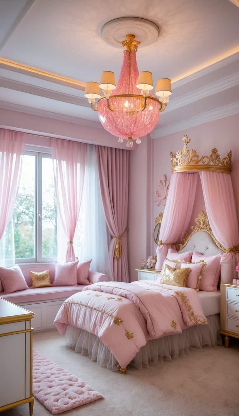 Blend princess charm with teen style by swapping out frills for chic accents like metallic lamps or sleek storage. A pink and gold glitter chandelier strikes that balance between glam and grown-up. Let her pick a statement piece—it’s her kingdom after all.