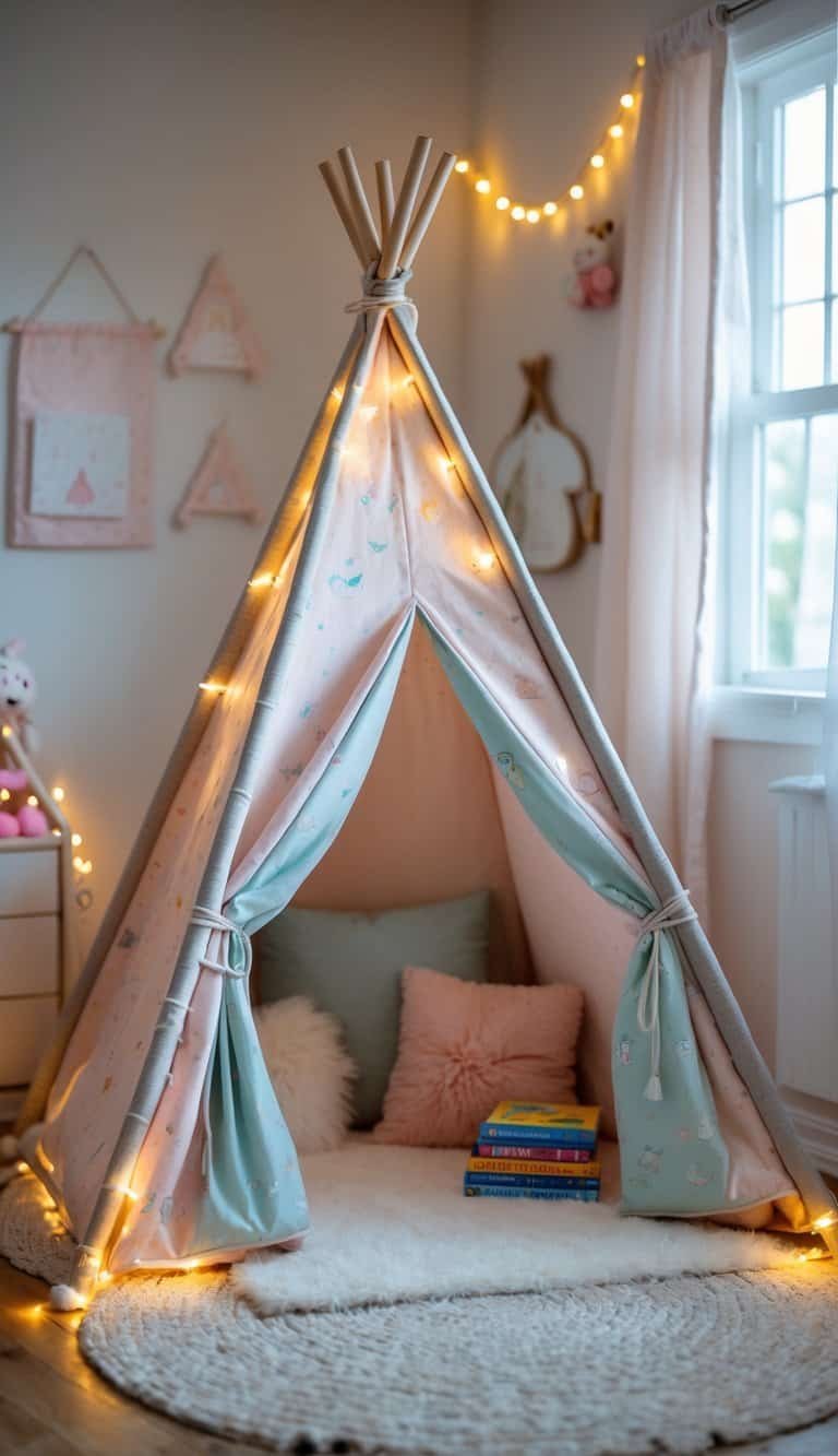 Girl Bedroom Designs For Kids - A cozy children's bedroom corner with a teepee tent decorated with fairy lights, cushions, and books.