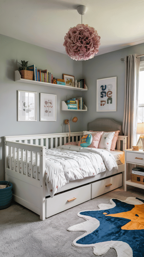 Built-ins are the unsung heroes of kids’ bedroom design. Under-bed storage drawers, wall-mounted shelves at kid height, and custom closet systems maximize every square inch while maintaining that clean, minimalist aesthetic.